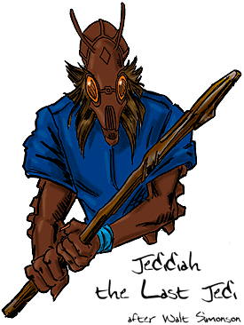 Description: Jedidiah is an alien student of the Force. He is tall and his gaunt features are insectoid. He wears the tattered robes of a Jedi Knight and carries a worn staff as if it were a lightsaber.